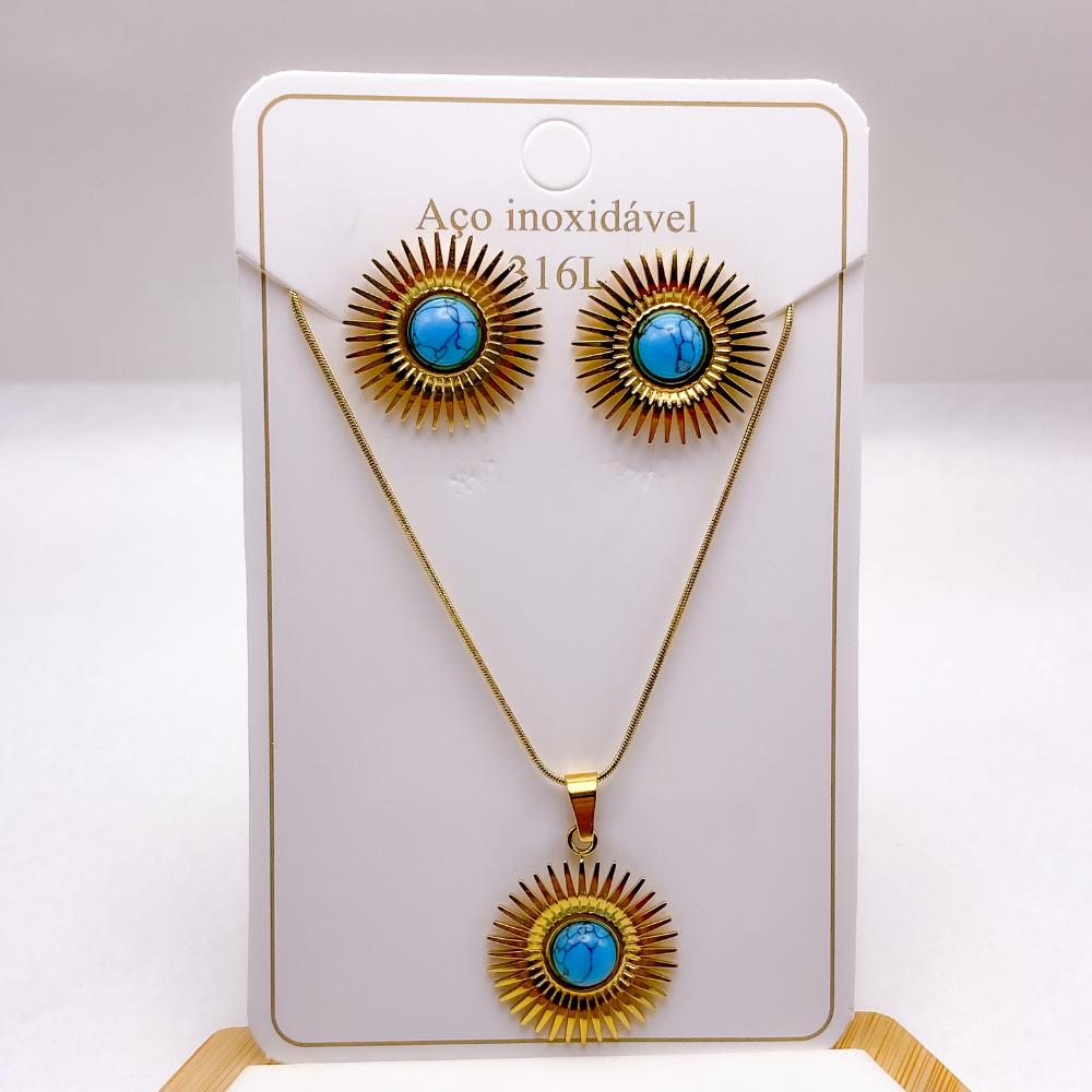 PRODUTO: CONJUNTO COLAR E BRINCO AÇO INOXIDAVEL PINGENTE RAIOS DE SOL PEDRA TURQUESA - DOURADO