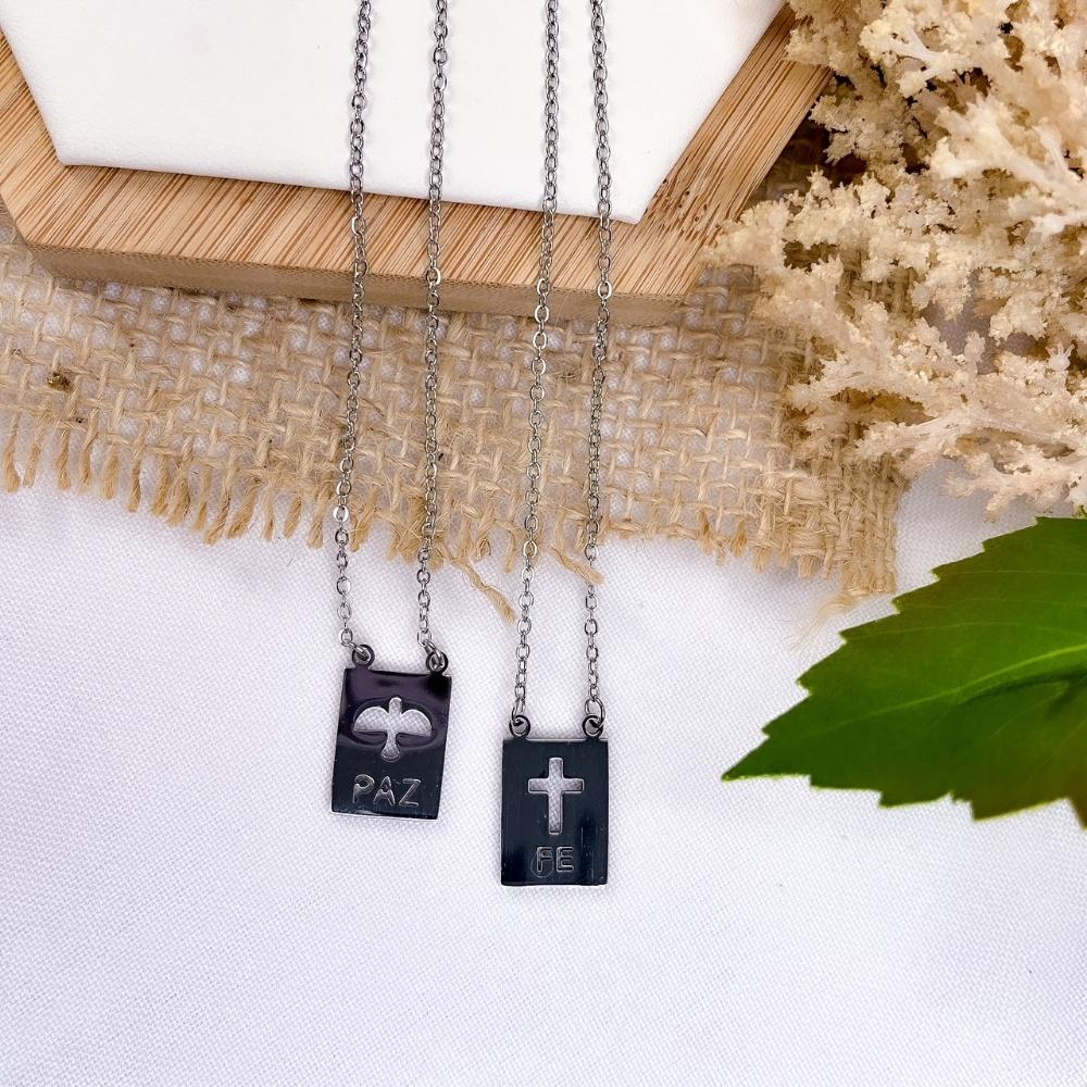 PRODUTO: ESCAPULÁRIO DE AÇO INOX PRATEADO 60 CM FÉ E PAZ
