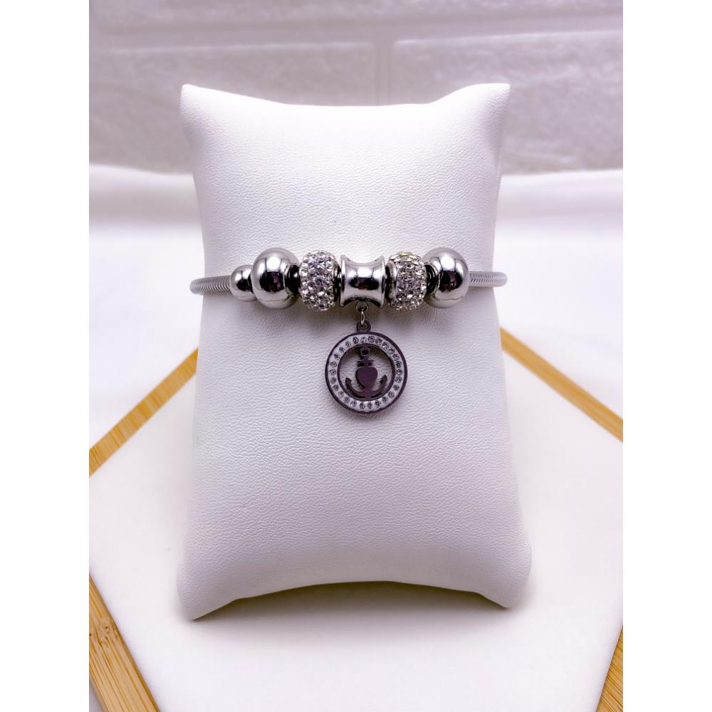 PULSEIRA AÇO INOX ESTILO PANDORA BERLOQUE ÂNCORA CORAÇÃO CRAVEJADO - PRATEADA