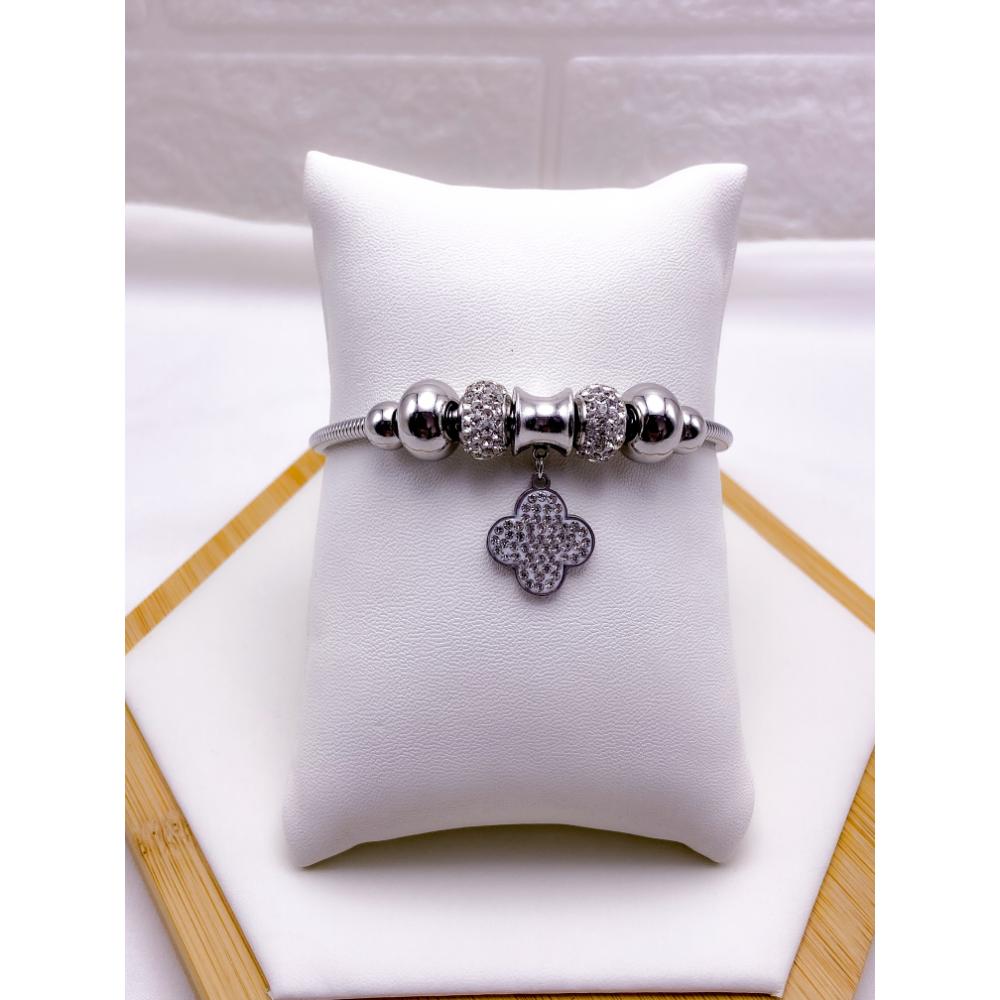 PULSEIRA AÇO INOX ESTILO PANDORA BERLOQUE TREVO CRAVEJADO - PRATEADA
