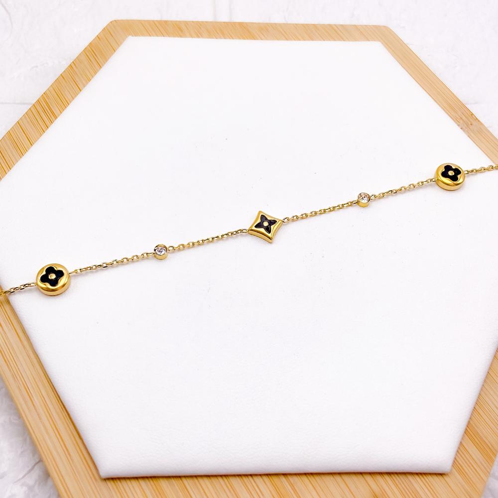 PULSEIRA AÇO INOX TREVO PRETO COM PEDRA CRISTAL - DOURADA
