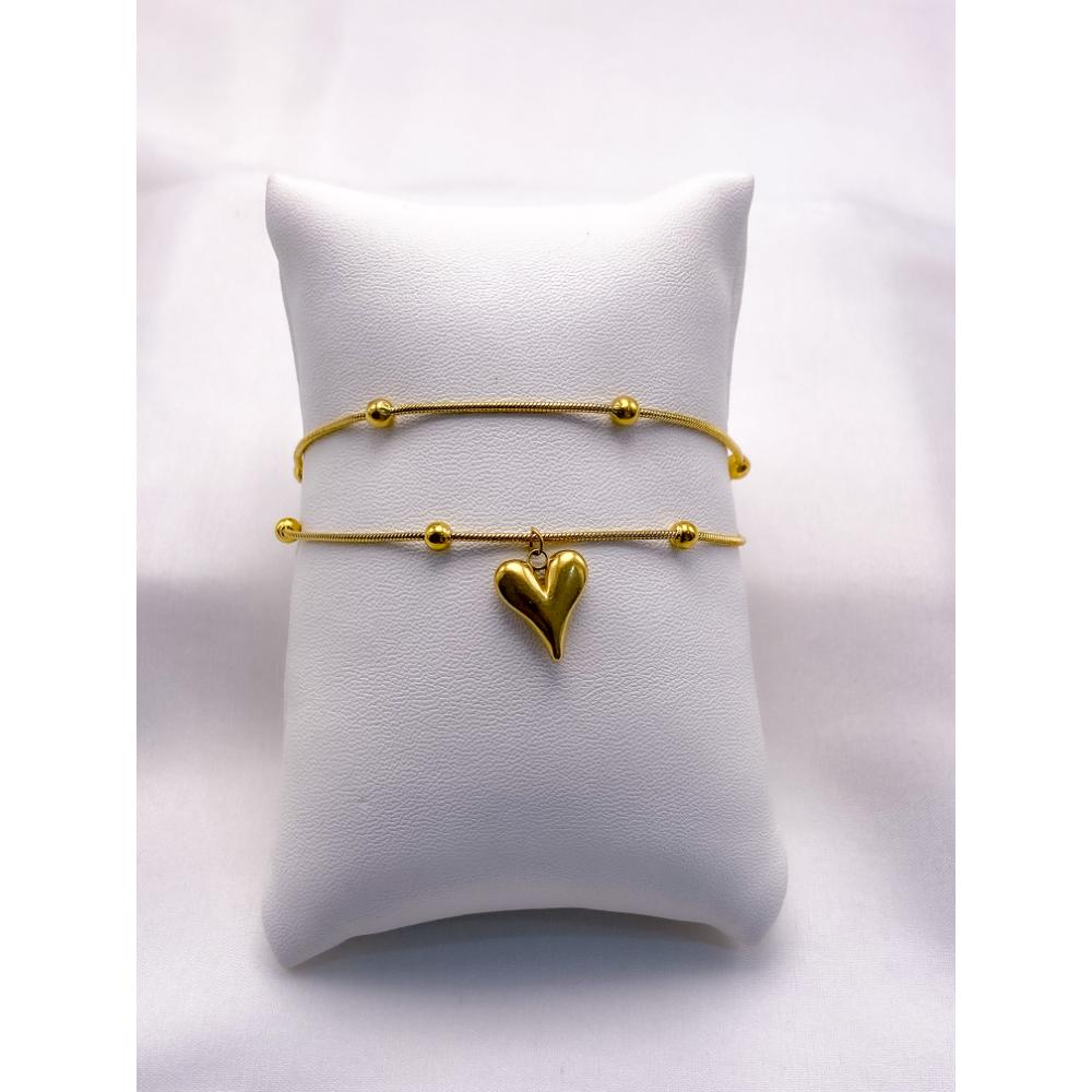 PULSEIRA AÇO INOXIDÁVEL DUPLA BOLINHAS PINGENTE CORAÇÃO - DOURADA