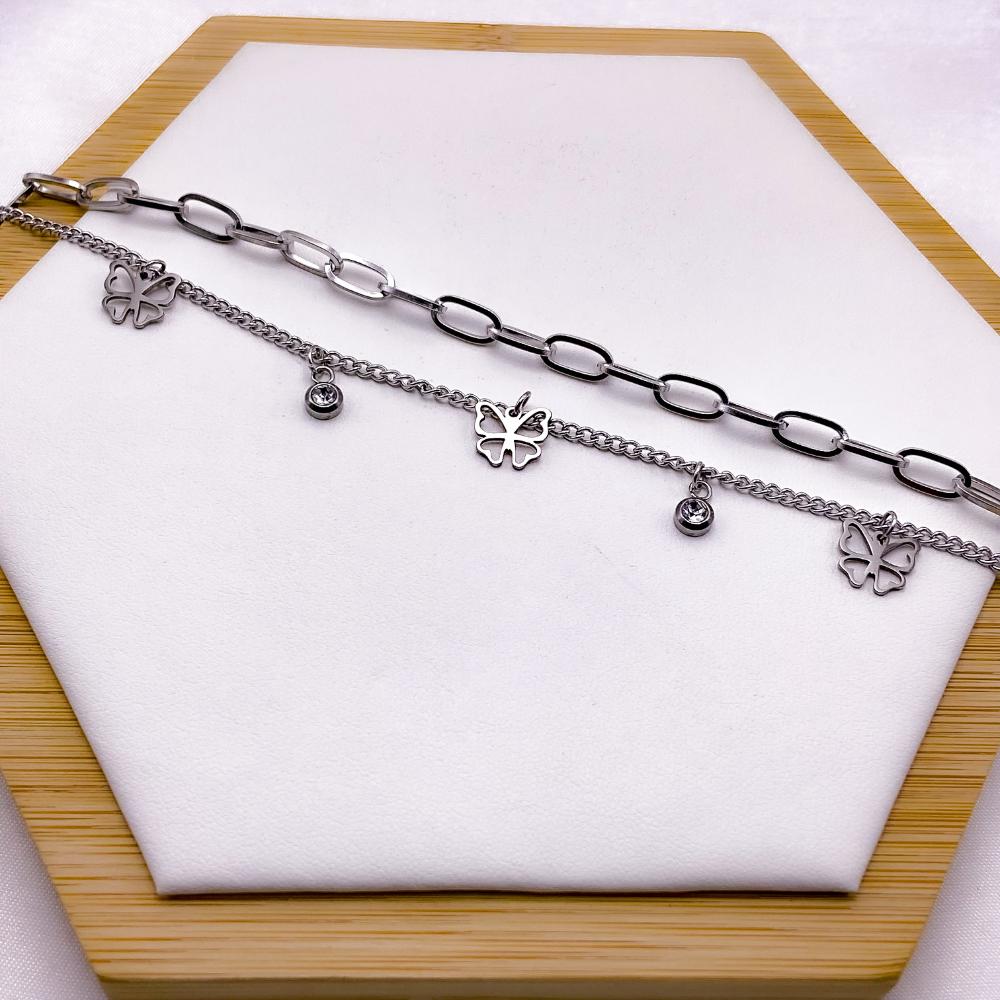 PULSEIRA AÇO INOXIDÁVEL DUPLA CORRENTARIA E BORBOLETA - PRATEADA