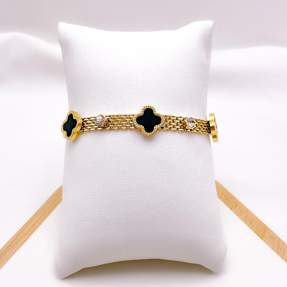 PULSEIRA AÇO INOXIDÁVEL PEDRA CRISTAL TREVO PRETO - DOURADA