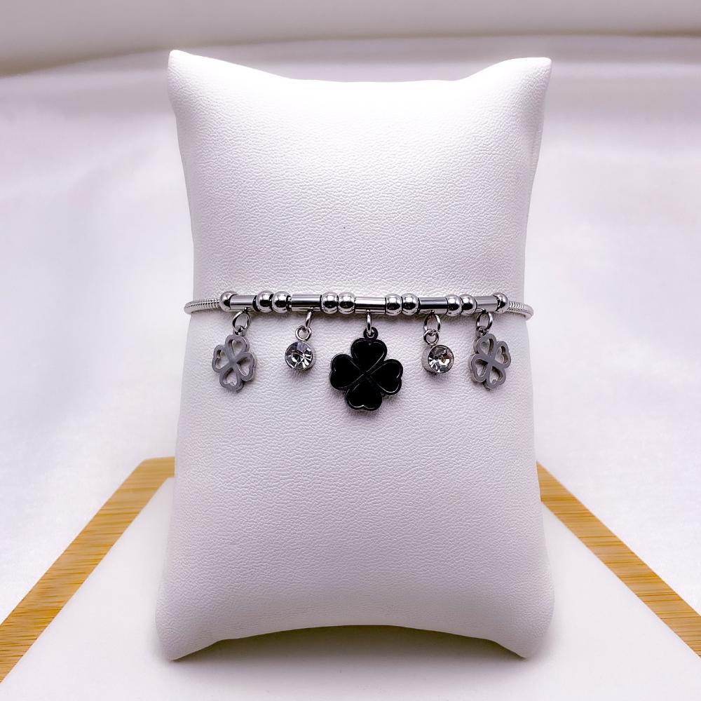 PULSEIRA AÇO INOXIDÁVEL TREVO PRETO - PRATEADA