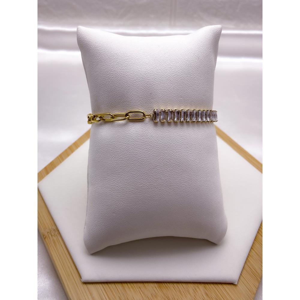 PRODUTO: PULSEIRA AÇO INOX CORRENTE E BAGUETE CRISTAL FECHO T - DOURADA