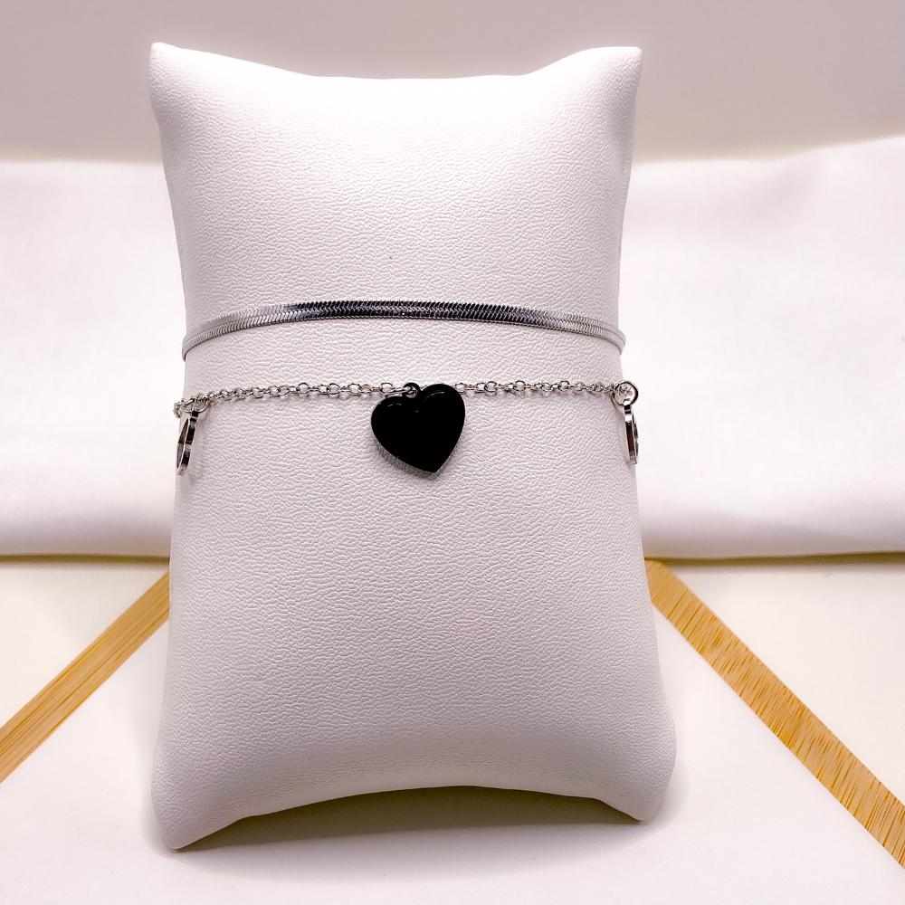 PULSEIRA AÇO INOXIDÁVEL DUPLA FITA E CORAÇÃO VAZADO PRETO - PRATEADA