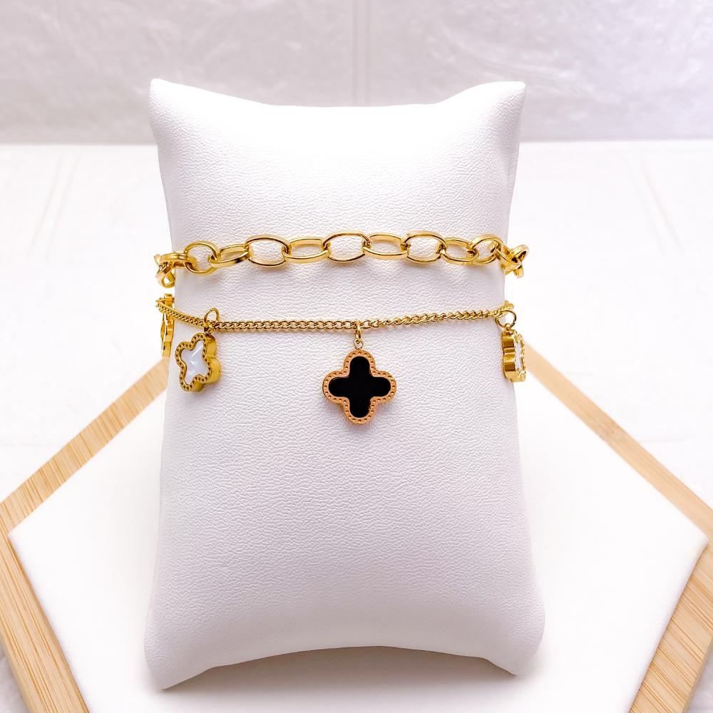 PULSEIRA DUPLA AÇO INOX DOURADA - TREVO PEROLADO E PRETO