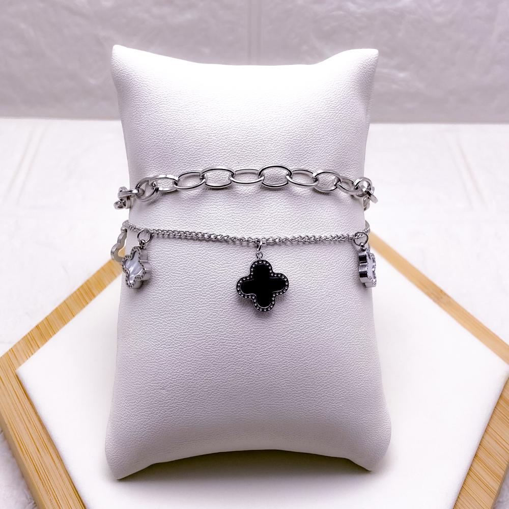 PRODUTO: PULSEIRA DUPLA AÇO INOX PRATEADA - TREVO PRETO E PEROLADO