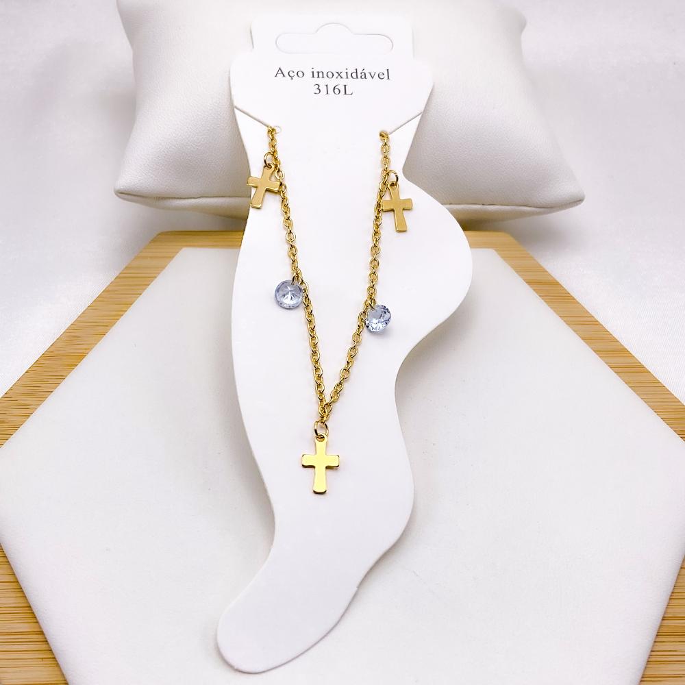 TORNOZELEIRA AÇO INOX CRUZ E PONTO DE LUZ - DOURADA