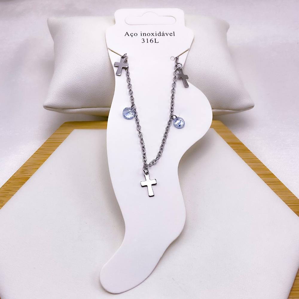 TORNOZELEIRA AÇO INOX CRUZ E PONTO DE LUZ - PRATEADA